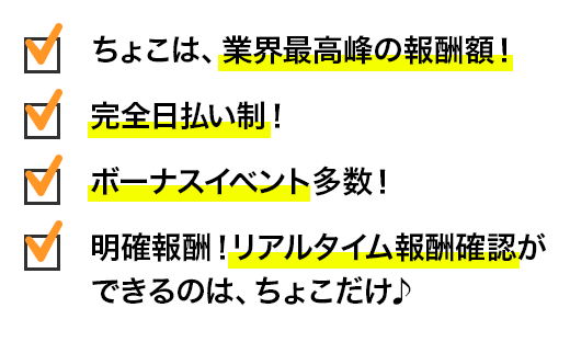 ちょこで継続している理由は、頑張ったら頑張った分だけたくさんのボーナスがもらえるし、環境がとても良いし、何よりここのスタッフがみんな良い人だから!完全自由出勤で完全日払い制なところも、働きやすく気に入っています。